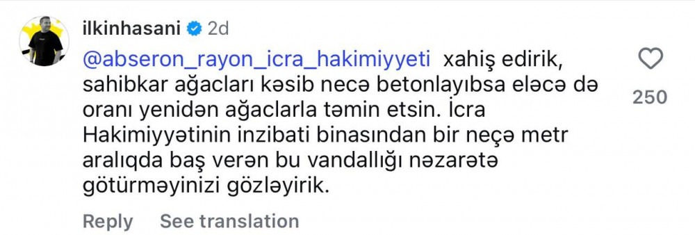 “Xahiş edirik, sahibkar ağacları kəsib necə betonlayıbsa, eləcə də oranı yenidən ağaclarla təmin etsin. İcra Hakimiyyətinin inzibati binasından bir neçə metr aralıqda baş verən bu vandallığı nəzarətə götürməyinizi xahiş edirik”,- deyə İlkin paylaşımında yazıb.