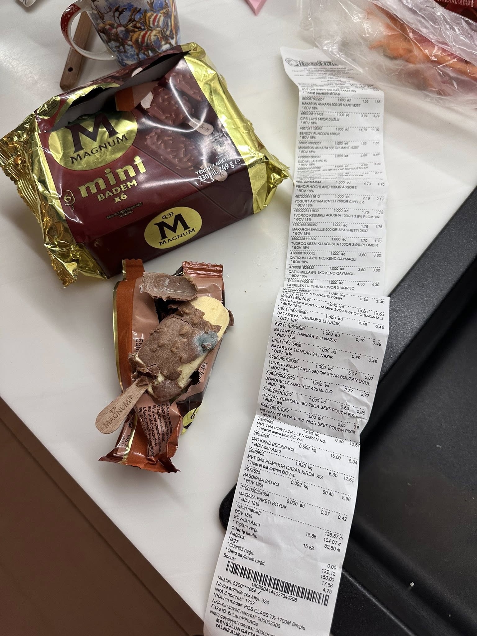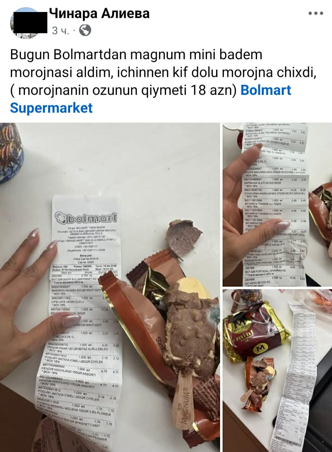 XALQ xəbər verir ki, “Müştəriyəm şikayətim var” sosial qrupunda Çinarə Əliyeva adlı vətəndaş paylaşım edərək Bolmartdan 18 manata aldığı dondurma kifli çıxdığı barədə şərh yazıb: O qeyd edib ki, “Bolmartdan magnum mini badem morojnasi aldim, ichinnen kif dolu morojna chixdi,( morojnanin ozunun qiymeti 18 azn)” deyə qeyd edib.