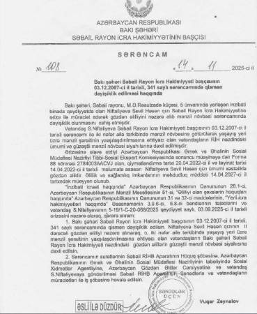 Poliqon xəbər verir ki, 2-ci qrup gözdən əlil olan Sabail rayonu sakini Niftaliyeva Sevil Həsən qızı Azərbaycan Respublikasının Prezidenti İlham Əliyevə müraciət ünvanlayıb. Şikayətçi müraciətində bildirib ki, gözdən əlil kimi 18 ildir mənzil növbəsində olsa da, hələ də mənzillə təmin olunmayıb. Halbuki ondan sonra növbədə olanların demək olar ki, hamısı Sosial Xidmətlər Agentliyi tərəfindən mənzillə təmin olunublar.